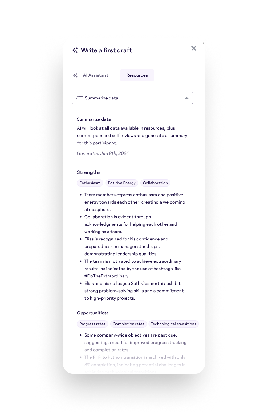 15Five AI makes the review process even easier for managers to give objective, data-backed feedback in seconds.